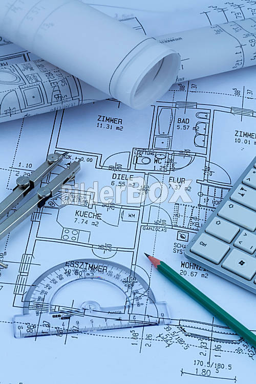 Beschreibung Ein Bauplan eines Architekten für den Bau eines neuen Wohnhauses. Symbolfoto für Finanzierung und Planung eines neuen Hauses.