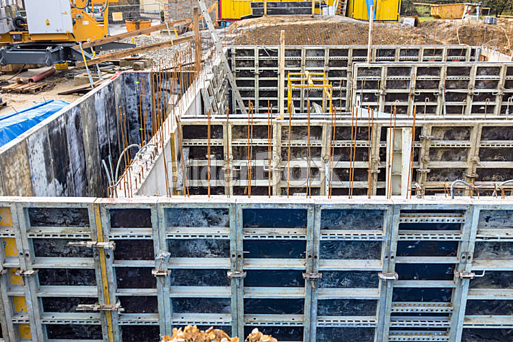 Beschreibung Baustelle, Keller, Schalung, Symbolfoto für Neubau, Stabilität und Bauwirtschaft