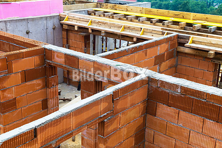 Beschreibung Ein Einfamilienhaus wird in Massivbauweise mit Ziegel gebaut.