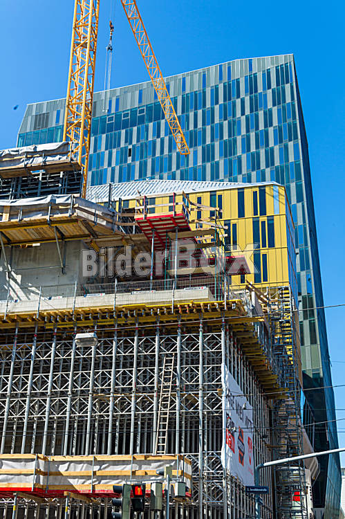 Beschreibung Baustelle und Baukran beim Bau eines neuen Büro und Geschäftshauses