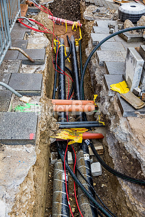 Beschreibung Auf einer Baustelle werden neue Leitungen für Wasser, Heizung, Fernwärme und Strom eingezogen. Baugrube mit Versorgungsleitungen