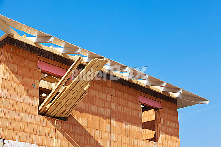 Beschreibung Rohbau auf einer Baustelle von einem Wohnhaus. Dachstuhl