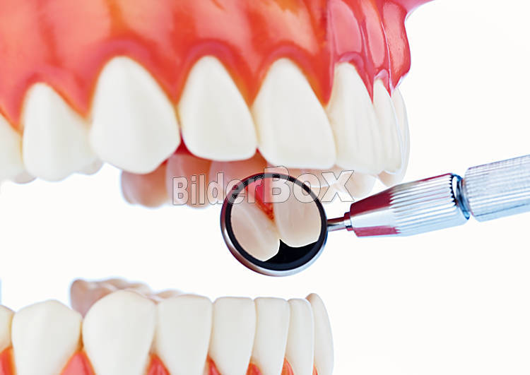 Beschreibung Das Modell eines Gebisses mit Zahnarzt Geräten. Isoliert auf weißem Hintergrund.