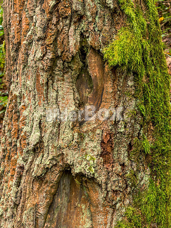 Beschreibung Baumstamm mit Moos. Alter Baum mit Baumrinde und Moos