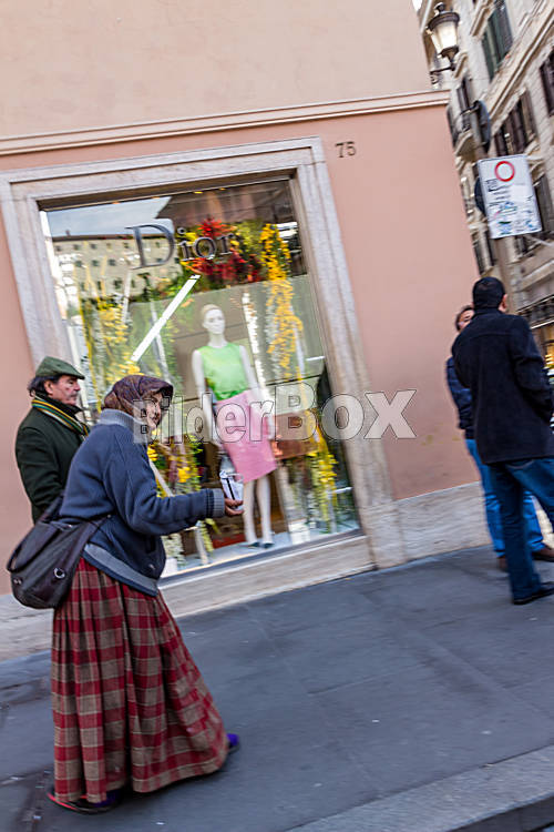 Beschreibung Bettlerin vor einem Laden mit neuer Mode im Schaufenster