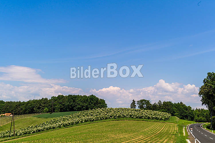 Beschreibung Holunder blüht an einem Strauch im Frühling.