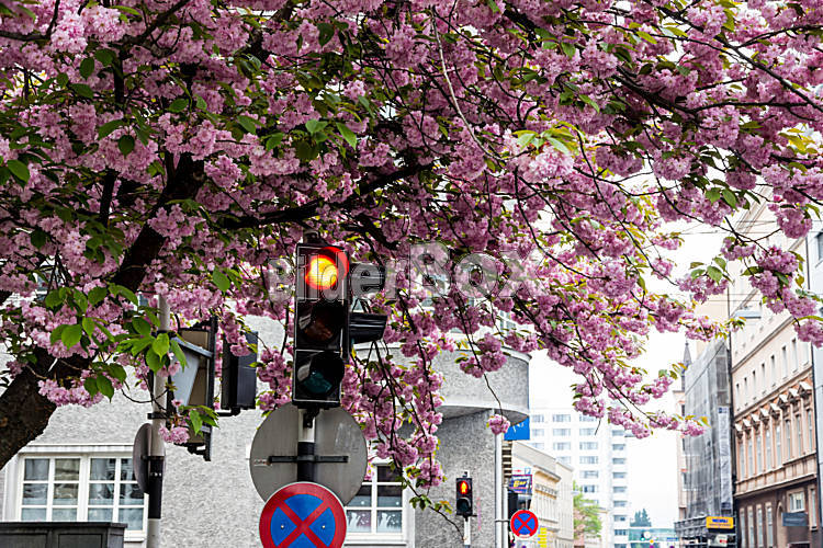 Blühender Baum und Mietshaus