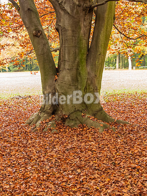 Beschreibung Ein Blatt auf der Rinde eines Baumes im Herbst. Farbenfroh in der Jahreszeit