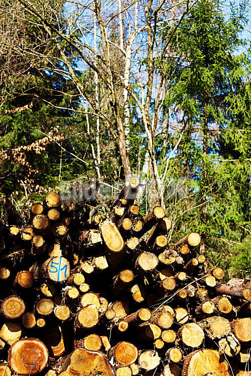 Beschreibung Holzstapel mit Brennholz wird in einem Wald gelagert.
