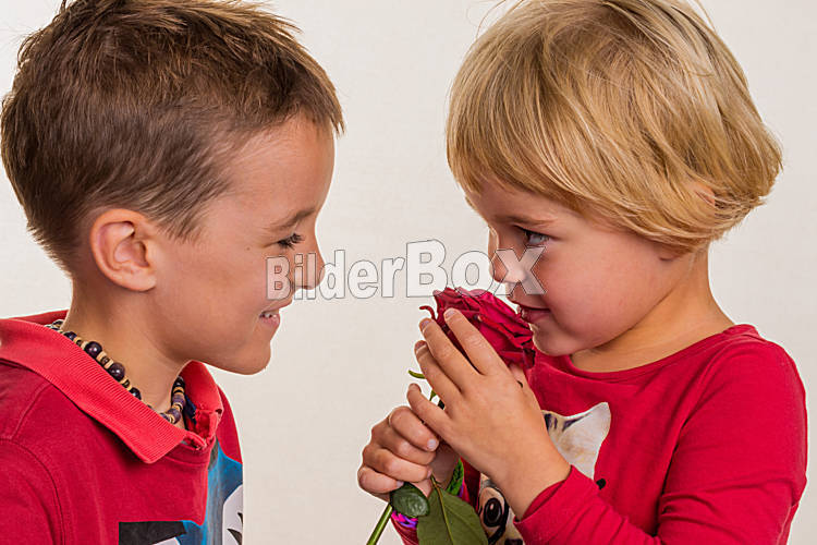 Beschreibung Ein Bub schenkt einem Mädchen eine rote Rose