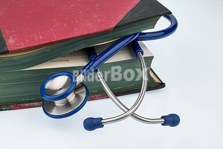 Beschreibung Buch und Stethoskop, Symbolfoto für Pfusch, Ärztefehler und Expertise