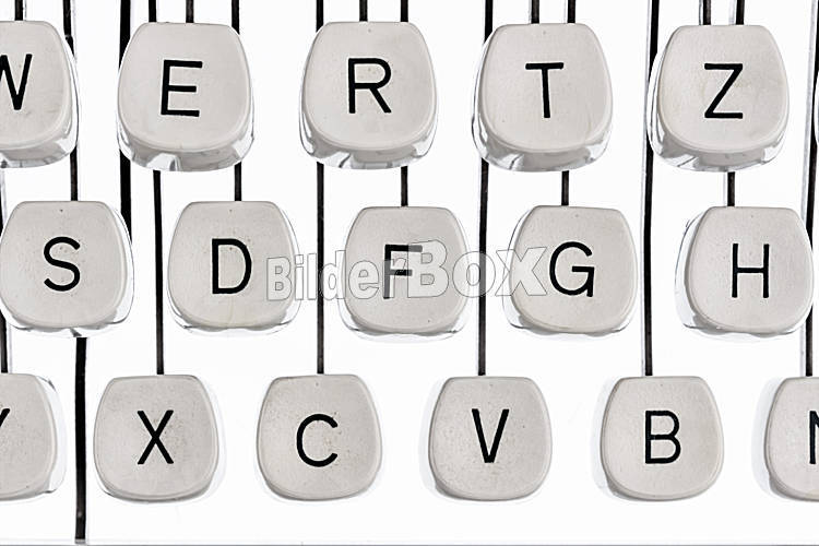 Beschreibung Tastatur und Buchstaben einer alten Schreibmaschine. Symbolfoto für Kommunikation in früheren Zeiten
