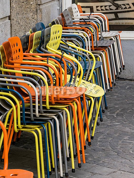 Beschreibung In einem Gastgarten sind bunte Sessel gestapelt. Symbol für Lockdown, Sperrtag und Ruhetag. Tourismusflaute