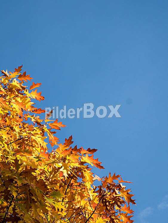 Beschreibung Bunte Blätter im Herbst vor freiem Himmel mit Textfreiraum.