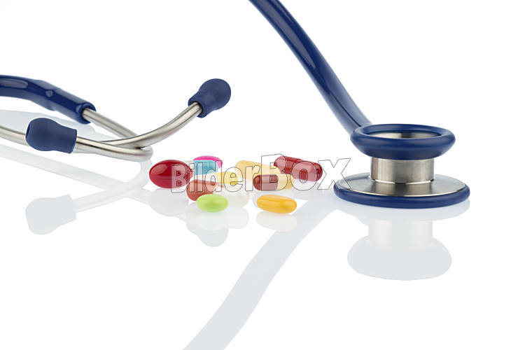 Beschreibung Bunte Tabletten und ein Stethoskop, Symbolfoto für Diagnostik, Herzkrankheiten und Wechselwirkungen