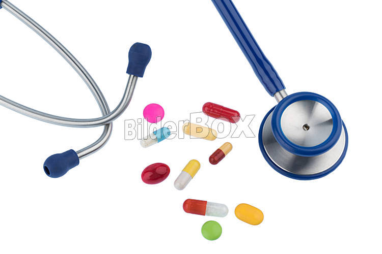 Beschreibung Bunte Tabletten und ein Stethoskop, Symbolfoto für Diagnostik, Herzkrankheiten und Wechselwirkungen