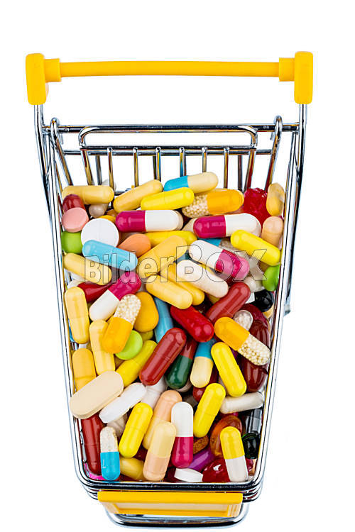 Beschreibung Bunte Tabletten im Einkaufswagen, Symbolfoto für Gesundheitskosten, Apotheken, Fülle an Medikamenten