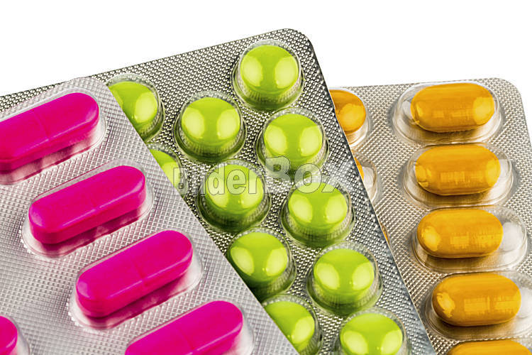 Beschreibung Bunte Tabletten in Blisterverpackung, Symbolfoto für Heilmittel und Gesundheitswesen