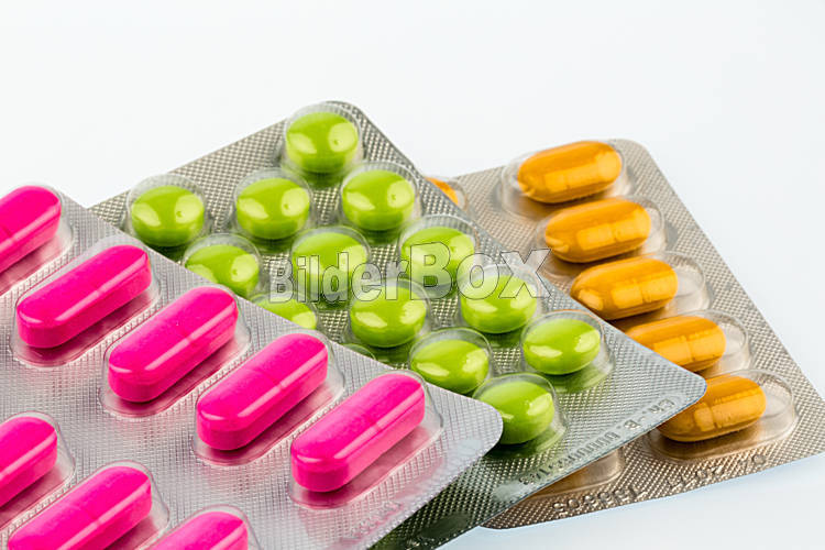 Beschreibung Bunte Tabletten in Blisterverpackung, Symbolfoto für Heilmittel und Gesundheitswesen
