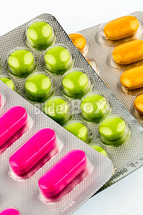 Beschreibung Bunte Tabletten in Blisterverpackung, Symbolfoto für Heilmittel und Gesundheitswesen