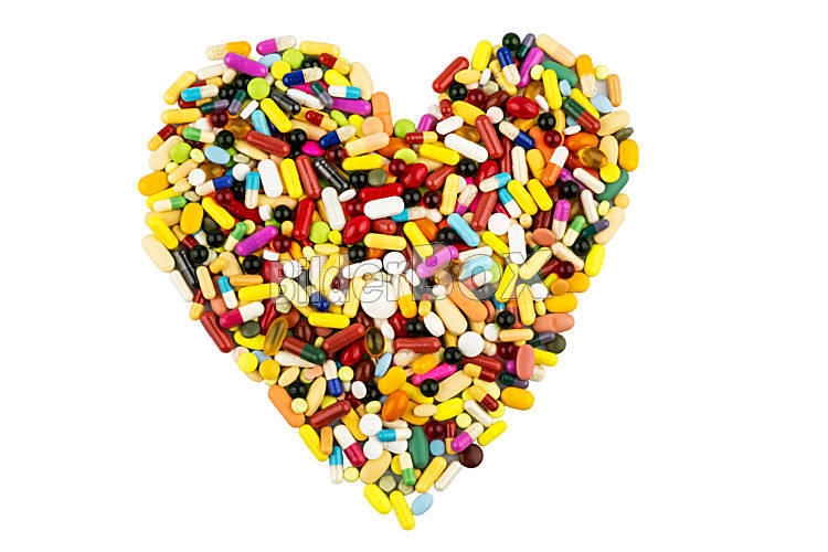Beschreibung Bunte Tabletten in Herzform angeordnet, Symbolfoto für Herzkrankheiten, Medikation und Pharmazeutika