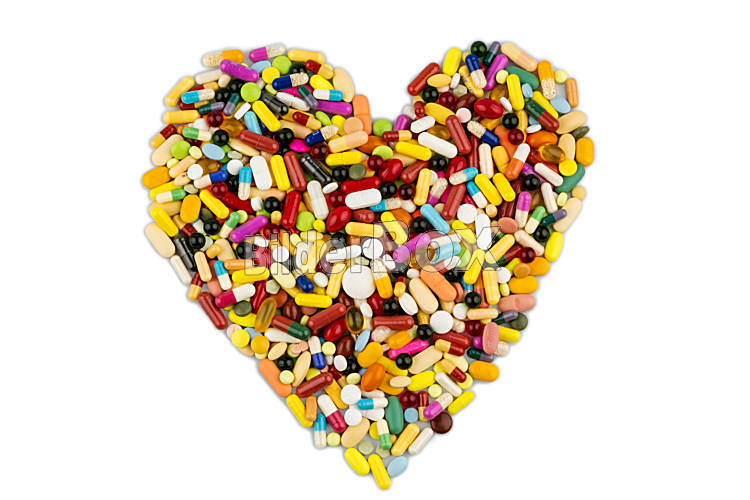 Beschreibung Bunte Tabletten in Herzform angeordnet, Symbolfoto für Herzkrankheiten, Medikation und Pharmazeutika