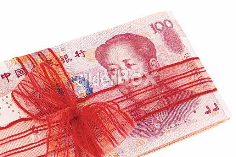 Beschreibung Chinesische Yuan Banknoten mit einer roten Schleife