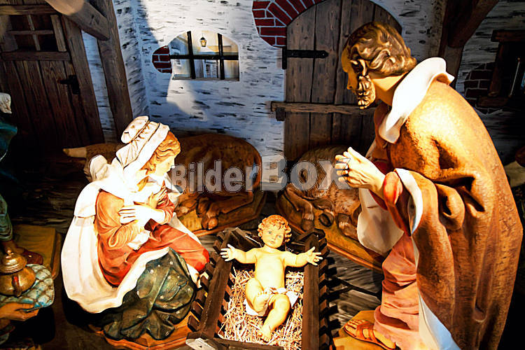 Beschreibung Ein Christkind liegt zu Weihnachten in einer Krippe im Stall.