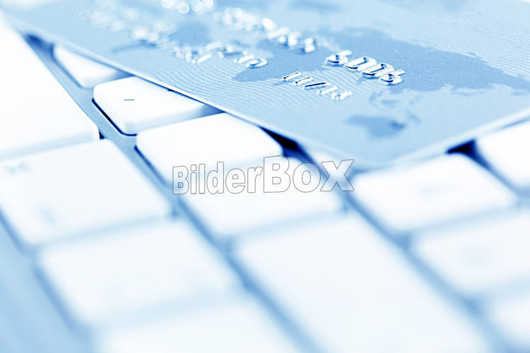 Beschreibung Auf der Tastatur eines Computers liegt eine Kreditkarte. Online Banking und Shopping