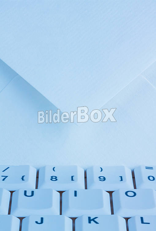 Beschreibung Die Tastatur eines Computers und ein Kuvert. Kommunikation über e-Mail.
