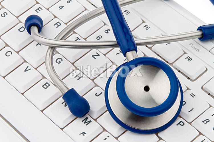 Beschreibung Eine Computer Tastatur und Stethoskop. EDV für Ärzte.