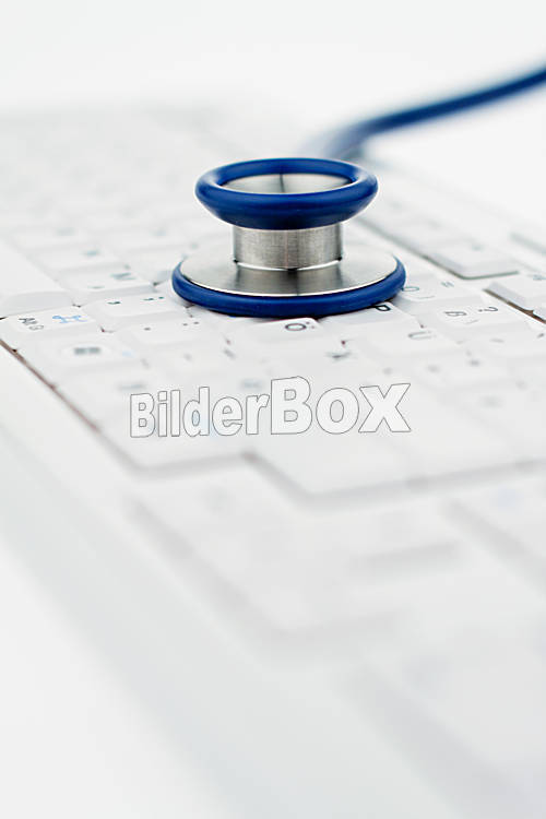 Beschreibung Eine Computer Tastatur und Stethoskop. EDV für Ärzte.