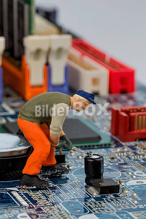 Beschreibung Computerplatine und Arbeiter, Symbolfoto für Computer, Störung, Wartung, Datensicherheit