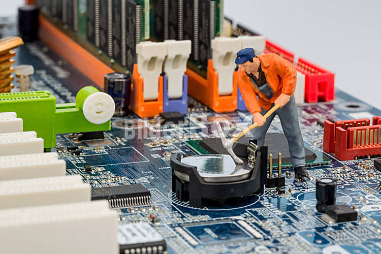 Beschreibung Computerplatine und Arbeiter, Symbolfoto für Computer, Störung, Wartung, Datensicherheit