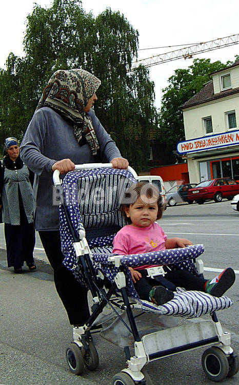 Religion,Islam.Türkisch,Türken,Tuerken,Tuerkisch,Ausländer,Auslaender,Miteinander,Gespraech,Gespräch,Kind,Kinderwagen,Kopftuch