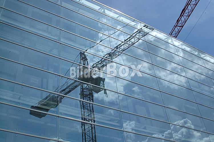 Baukran spiegelt sich in einer Glasfassade