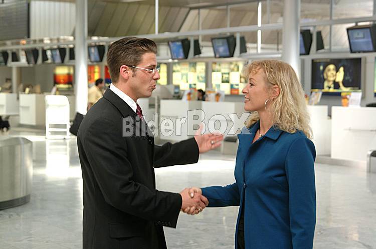 Erfolgreicher Mann und Frau mit Notebook Handshake