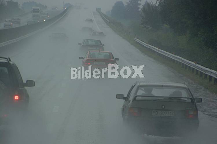 Autobahnverkehr bei schlechter Sicht durch starken Regen.