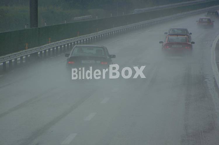 Autobahnverkehr bei schlechter Sicht durch starken Regen.