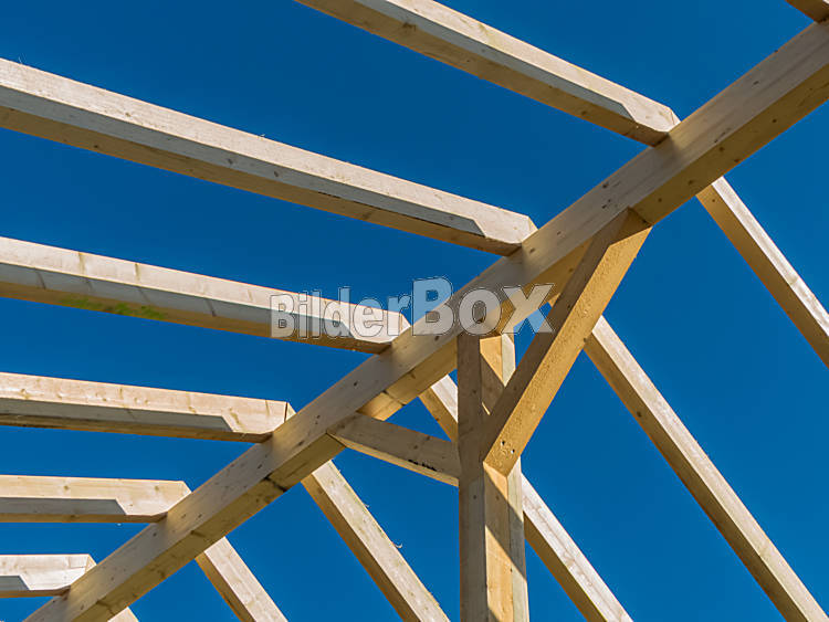Beschreibung Auf einem Haus wird auf einer Baustelle ein neues Dach gebaut. Träger aus Holz für Dachstuhl.