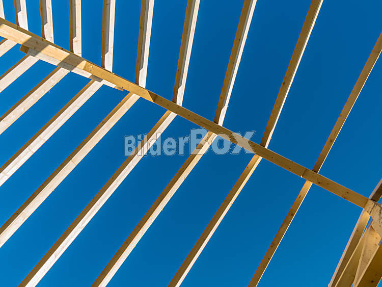 Beschreibung Auf einem Haus wird auf einer Baustelle ein neues Dach gebaut. Träger aus Holz für Dachstuhl.