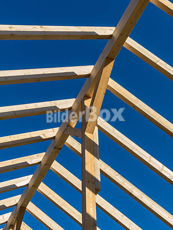 Beschreibung Auf einem Haus wird auf einer Baustelle ein neues Dach gebaut. Träger aus Holz für Dachstuhl.