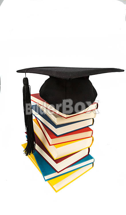Beschreibung Ein Doktorhut auf einem Bücherstapel, Symbolfoto für Bildung und Kompetenz