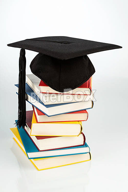 Beschreibung Ein Doktorhut auf einem Bücherstapel, Symbolfoto für Bildung und Kompetenz