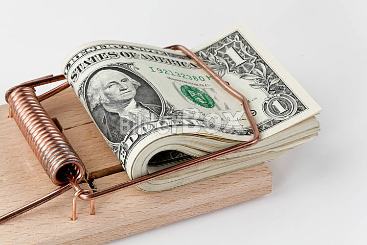 Beschreibung Viele amerikanische Dollar Geldscheine in Mausefalle. Schulden Falle