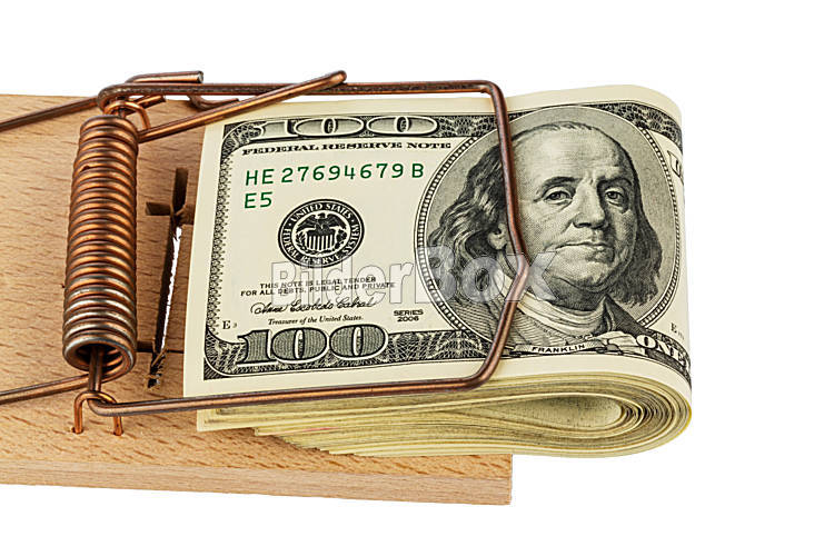 Beschreibung Dollar Geldscheine in einer Mausefalle. Symbolfoto für Schulden