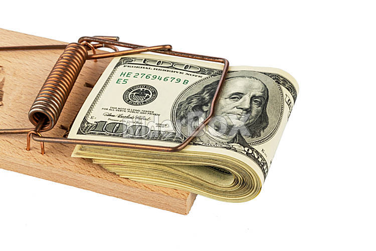 Beschreibung Dollar Geldscheine in einer Mausefalle. Symbolfoto für Schulden