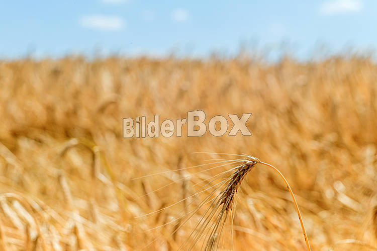 Beschreibung Eine Getreide Ähre auf einem Getreidefeld. Gerste in der Landwirtschaft vor der Ernte.