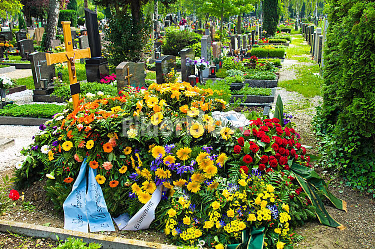Beschreibung Auf einem Friedhof befindet sich ein frisches Grab nach einem Begräbnis.