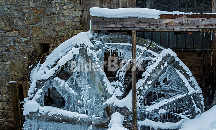 Beschreibung Eingefrorenes Mühlrad. Symbolbild für Energieausfall und Betriebsschließung und Kurzarbeit